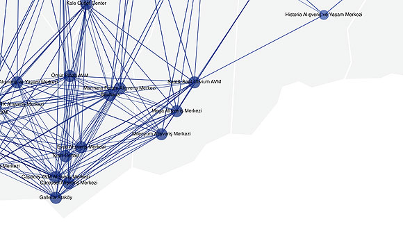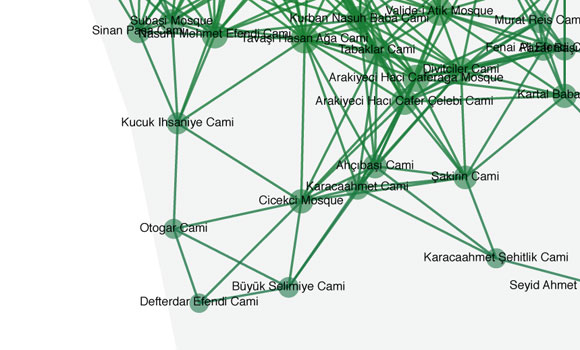 Burak Arikan delves into new symphonic spaces in the city, in the way networks are built and become definitions of new meaning entities. In his work “Islam, Republic, Neoliberalism”, Burak has drawn a complex diagram that analyses the relationships established between mosques, republican monuments and shopping centres in Istanbul, as they represent the three ideologies with the greatest scope in contemporary Turkey. Beyond functioning as a simple map, its complex rhizome designs reveal the spatial patterns of these ideologies through physical relationships and representations of power. For example, this network of mosques represents the way in which the calls to prayer from more than 3,000 mosques all over the city are melded together.